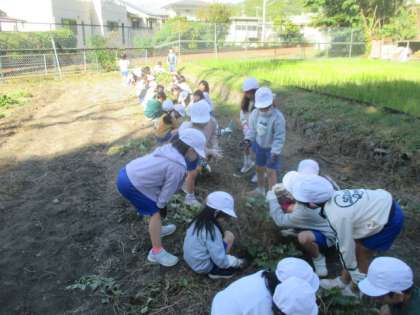 5月に畑に植えていたさつまいもを掘りました。1年生の子どもたちは、予定表が配られた先週の金曜日から楽しみにしていた様子で、畑に向かうときから張り切っていました。