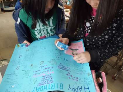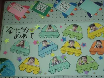 学級目標は最後の年も「きんピカ」です。一人ひとりがきんピカ目指してがんばりたいことも掲示しました。担任もクラスの仲間も変わらずスタートを切ったので,係活動もさっそく頑張っています。みんな遊びでも花マルがついています。小学校生活最後の年は,お誕生日に寄せ書きをプレゼントすることになりました。また一つ素敵な思い出が増えそうですね。
