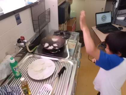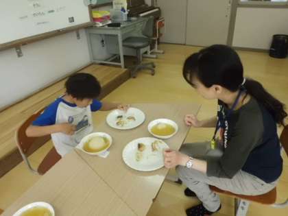 学校で育てていた玉ねぎを収穫したので,オニオンスープと玉ねぎステーキを作りました。玉ねぎの皮をむいたり,切ったり,焼いたり,煮たり。「目が痛い。」と言いながらも,一生懸命作りました。できあがった料理は,2人の先生をお招きして,4人でおいしくいただきました。