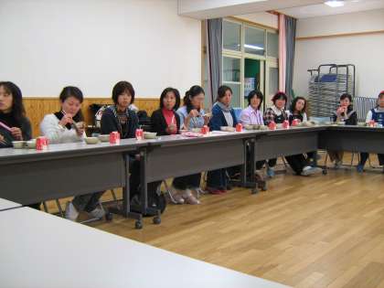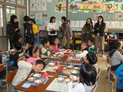 ふれあいサロンで給食の歴史や食育のお話を聞いたあと,1年の教室に我が子の給食風景見学。その間にPTAの学年委員さんに給食を配膳していただきました。学年委員さんも,「給食当番」は久しぶりだったのではないでしょうか。教室から戻った参加者の皆さんと,「給食当番」さんで仲良く「いただきます」。食後にはみなさんからいろいろな感想をいただきましたが,ここではひとつだけ紹介します。