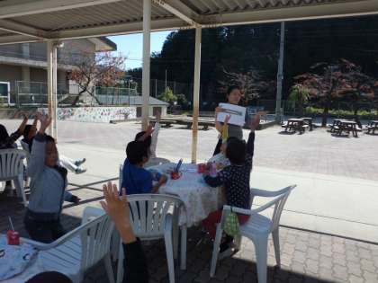 今年2回目の「青空給食」は,1・2組とも名前の通り,気持ちの良い青空の下での給食になりました。広い空にぽっかり浮かんだ雲を「くじらぐもみたい」「かめにみえる」「こんどはうまみたいになった」と見つけながら,中庭での給食を楽しみました。