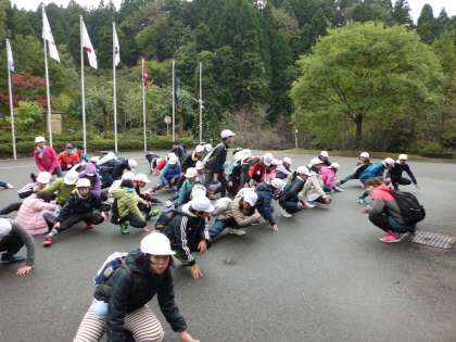 少し曇っていますが,暑くなく・寒くなく絶好の山日和。朝の集いは3校合同で行ったのですが,3校の中では一番上手に(他の2校も「うちが一番」と思ってるでしょうね…。お互い様です。),学校紹介をし,静かにかつ,大胆に(?)朝食をたいらげ,トイレも済まし,イザ登山へ!入念な準備運動後,笑顔で「行ってきまーす」。ビフォー・アフターはまた,ノチホド…