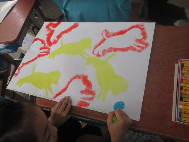 今日は、昨日の生き物に目や爪などをクレパスで描きました。