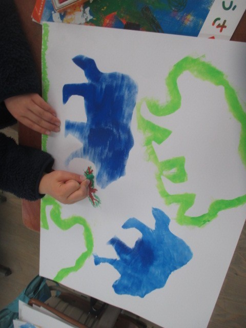 パフに絵の具をつけて、ポンポンすると、生き物が浮かび上がってきました。