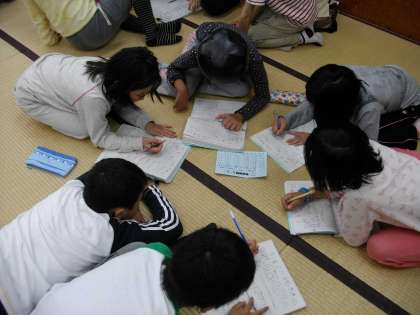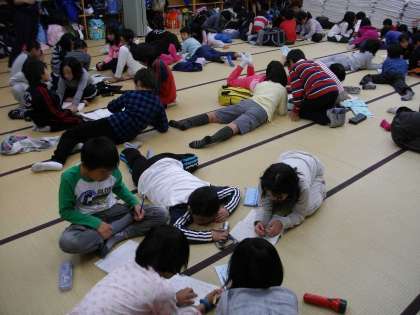 60畳の大広間で,班ごとに一日の反省を話し合いました。