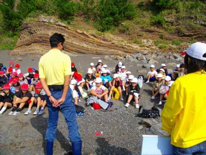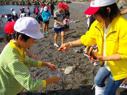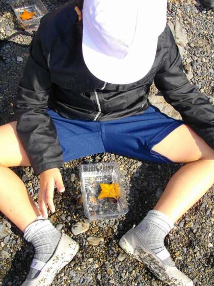 宮崎浜での活動です。マリンランドの学芸員の方から,磯浜の生物と潮の干満について教えていただきました。ヒトデを一人一匹ずつ貸していただき,観察の仕方を教えていただきました。