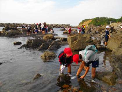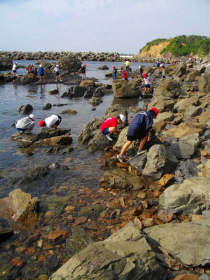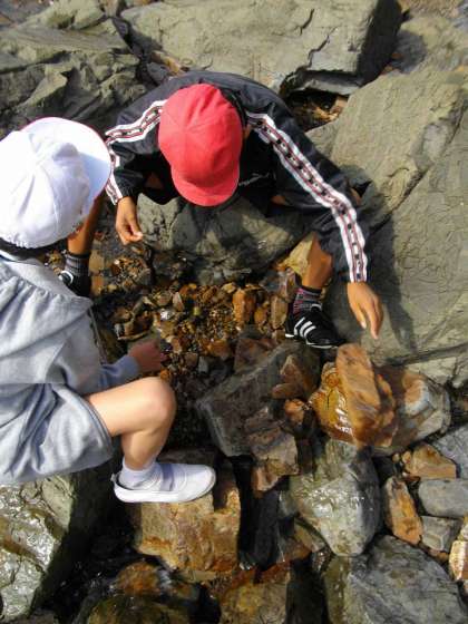 磯の観察の様子です。ヤドカリや小魚やカニがたくさん見つかりました。中にはタコを見つけて,吸盤に吸い付かれた人やスミを吹きかけられた人もいました。とても貴重な経験ができました。磯のところの地層も覚えておいてほしいと思っています。