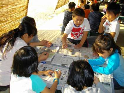 宮崎浜で拾った石に絵や字を描いて『おみやげ』を作ります。