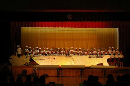 今日は国語で学習した「くじらぐも」を音楽劇で発表します。広くて青い空の様子や子ども達の楽しい気持ちが伝わるように頑張りました。