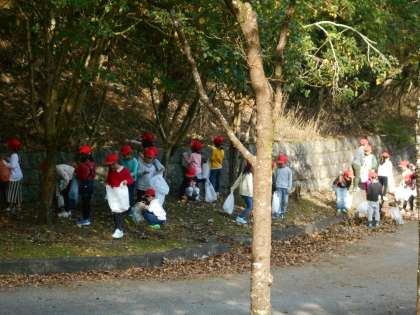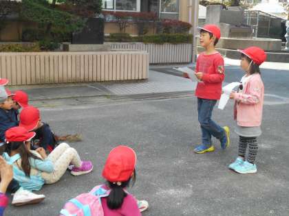 今日はぽかぽかお天気で秋みつけにはとっても素敵な日でした。宝ヶ池まで電車に乗っていざ出発。宝ヶ池にはどんぐりやきれいな落ち葉がたくさんありました。「帽子をかぶったどんぐりをみつけたよ。」「先生みてみてー。」とこどもたちは大興奮でした。
