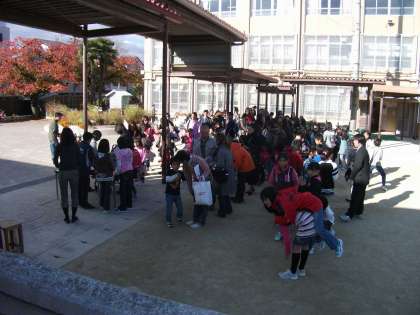 就学時健康診断の受付の様子です。ちょっぴり不安そうな子,小学校への来校を楽しみにしてはしゃいでいる子,保護者の方に連れられて受付に並んでいます。