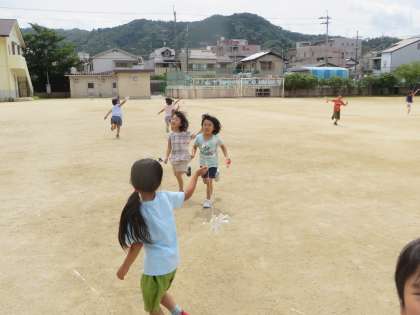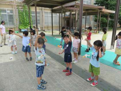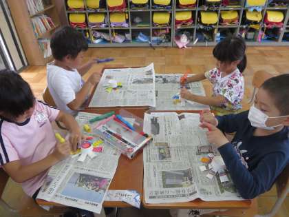 図画工作で「クルクルまわして」の学習をしました。紙コップを使って,風でクルクル回る作品を作り,みんなで運動場で走ったり,風が吹くのを待ってクルクル回したりしました。自分で描いた模様が,回ると違う色や模様に見えて,楽しそうにしていました。