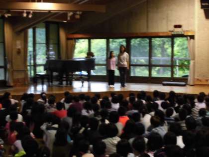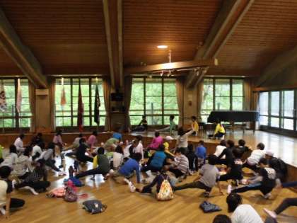 2日目の朝を迎えました。昨夜雨がふり,今は,雨はやんでいますが,今日は雨もようの天気です。子どもたちは,多少眠そうな子もいますが,全員元気です。7時から宿泊している5校の全員が集まって朝の集いをしました。代表の人が学校紹介をしました。その後,修学院第二小だけで,朝の体操などをしました。朝ごはんもたくさんいただきました。