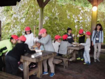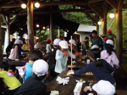 野外炊事で使う火をまずおこしました。だんだんこげくさい匂いがしてきて,黒く焦げて,煙がでてきて,火がおこりました。