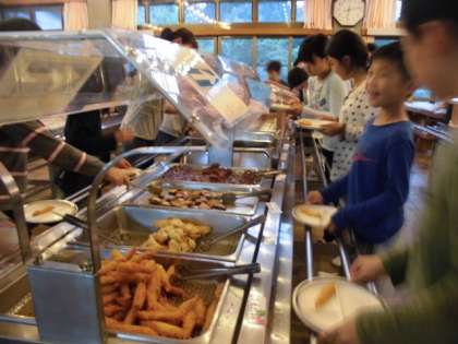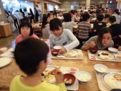 楽しみにしている夕食の時間です。エビフライにあげ餃子,ミニハンバーグにじゃがいものそぼろ煮,さばの塩焼き,野菜のあえもの,サラダなどなど。イチゴのゼリーのデザートつきでした。