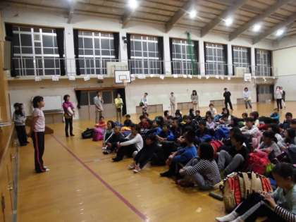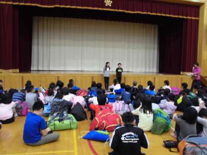 「無事カエル」の願いを込めたカエルの被り物をした花背の職員の方に見送られながら花背を出発しました。無事学校に到着し,体育館で帰校式を行いました。