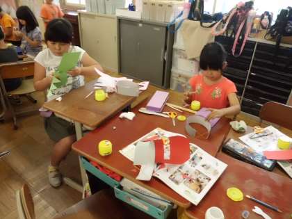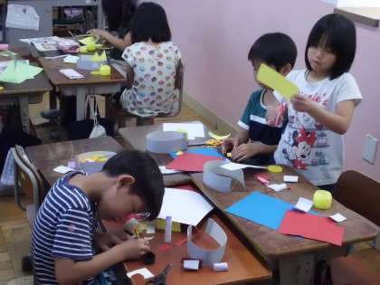 図工の学習でわっかを使っていろんなものに変身しました。頭にわっかを付けたり,手首や足首にもわっかをつけておしゃれに変身したり,かっこよく変身したり,いろいろなものに変身することができました。
