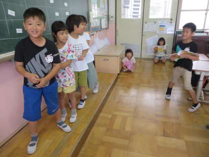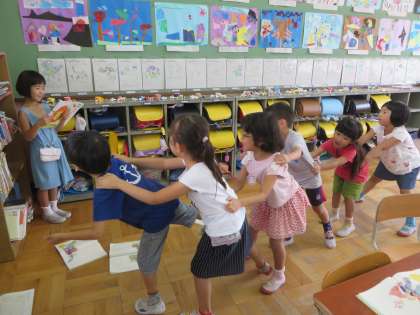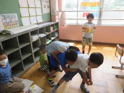 国語で「おおきなかぶ」の学習をしています。かぶを引っ張る様子を,「うんとこしょ,どっこいしょ。」と本当に引っ張っているように,声の出し方,動き,表情を工夫しながら練習を頑張っていました。