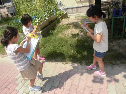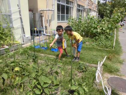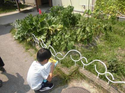 生活科の「なつだ とびだそう」の学習で,学校の中の「なつ」をさがしに行きました。きゅうりやなす,つるれいしなどの夏の野菜を見つけたり,「太陽がぎらぎらしてる。」「はっぱがいっぱいある。」などに周りの様子に気付いたりしている子もいました。いろいろな発見がありました。