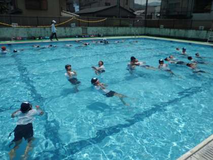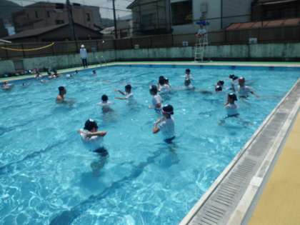 踏水会の先生方に来ていただき,着衣泳を行いました。服を着ていると,いつもより泳ぎにくいことがよくわかりました。もしも川に落ちてしまったときに自分で身を守る方法やおぼれている人の助け方についても学習することができました。