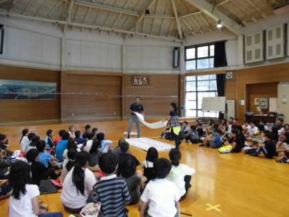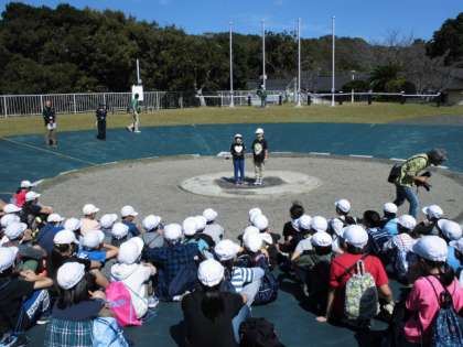 昼食後は,入所式を外で行い,その後プレーホールでオリエンテーションを行いました。みさきの家の先生にシーツのたたみ方などを教えていただきました。