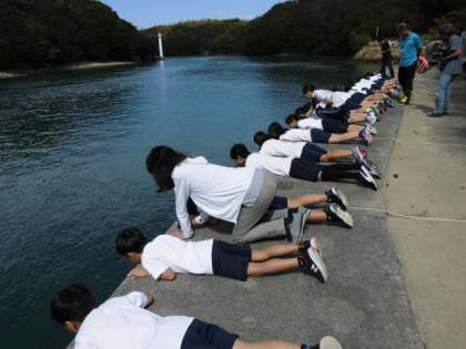 みさきの家のすぐ前にある深谷水道を泳いでいる魚の観察をしました。みさきの家の所員さんが,えさのおきあみをまくと,小さないわしなど,たくさんの魚が集まってきました。