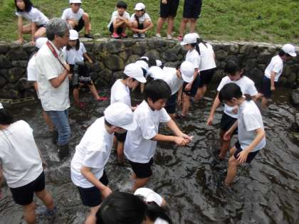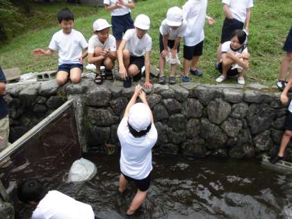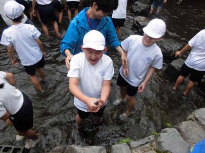 魚つかみに必死です。水がとっても冷たいのですが,何とか捕まえようと頑張っています。