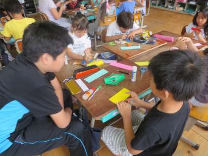 2年生とに組のみんなで,七夕かざりを作りました。短冊に願い事を書いたり,あみかざりやちょうちんなどのかざりを作ったりしました。に組のお友達に作り方を教えてもらいながら楽しい飾りが出来上がりました。