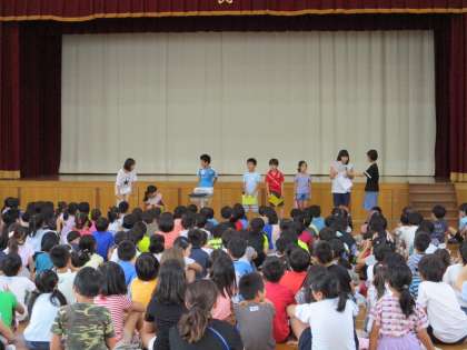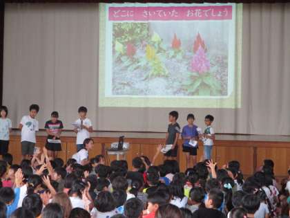 はじめに全校で「少年少女冒険隊」を歌い,その後,飼育園芸委員会からは校内のお花に関するクイズを,運動委員会からは遊びの紹介をしてもらいました。