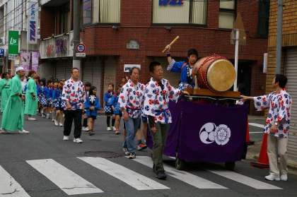 お祭りの行列は結構長く,信号や踏切で間があくと,休憩を兼ねて後続を待ちました。