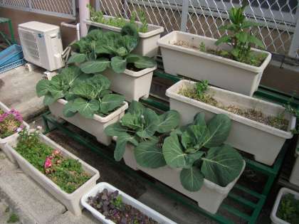 キャベツは3年生が植えました。肥料をやって水をやって育てています。暖かいというより暑さを感じる頃より,急に大きくなりました。小さなプランターに植えたので,はみ出さんばかりの成長です。畑に移植しようか?思案中です。