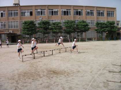 5年生がハードル走の練習を始めました。3歩のリズムに合うハードル間の距離を見つける練習をしました。ハードルのコツは,跳ぶのではなくまたぐことです。先日アスリートの走りを実際に見た5年生に期待しています。