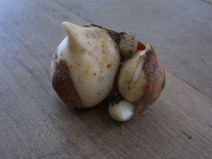 もとの球根の周りに小さな球根がいくつかついていました。