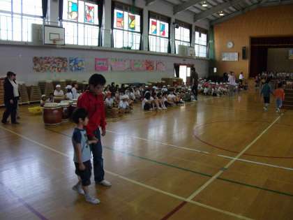 2年生から5年生は先に入場しています。1年生は,6年生に手を引いてもらって一緒に入場し,階段の一番高いところで担任の先生から名前を読んでもらって大きな声で「はい」と返事をします。1年生の座席であるステージの長いすに座って開会を待ちました。