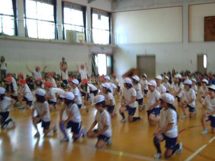 井上先生のキーボードの曲に合わせて,元気いっぱい全身で表現する子どもたち。