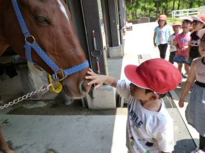 平安騎馬隊の馬を見学し,ひとりずつ馬を触らせてもらいました。