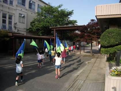 運動会が近づいています。5月20日のドリバンは,音楽室で練習した後,フラッグも参加して外で行進しながら演じました。これから練習にいっそう熱が入ります。