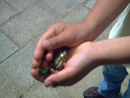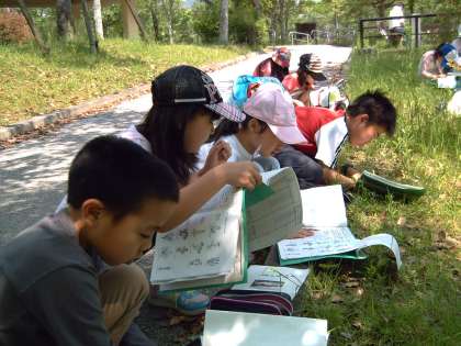 小川での自然観察で,カエルやサワガニをみつける子どもたち。