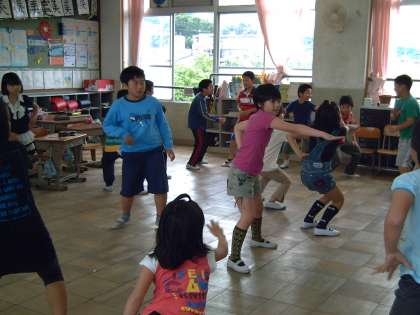 教室で『よさこいソーラン〜よっちょれどっこいしょ〜』の練習をしています。