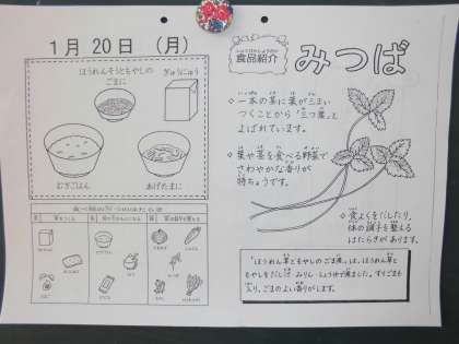 「あげたま煮」には,みつばを使っています。にんじんやパセリなどと同じセリ科の植物で1本の茎に3枚ずつ葉がつくことから「三つ葉」と名付けられました。みつばの爽やかな香りには、食欲増進効果や消化促進効果があります。