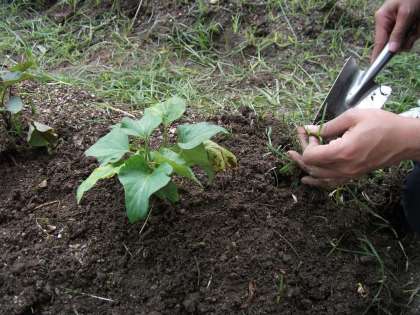 2年生の花壇では,サツマイモ以上に雑草が育っていました。水やりと共に,雑草抜きも大切な手入れですね。
