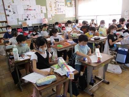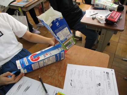 4年生の理科では,「わたしたちの体と運動」という学習をしています。筋肉や骨がどのような働きをしているのか知るために,牛乳パックを使って骨と筋肉の模型を作りました。出来上がった牛乳パックを動かすと,筋肉に見立てた紙テープが伸びたり縮んだりします。「こんな風に動くのか」とみんな理解することができました。自分の体がどのような仕組みで動くのか,みんな楽しんで学習しています。