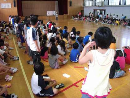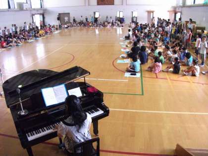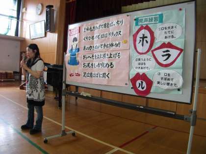 7月6日に児童朝会がありました。普段ならまず全員で合唱するのですが,今回は,まず4年生による発声練習のお手本がありました。正しい姿勢から美しい歌声が響きました。