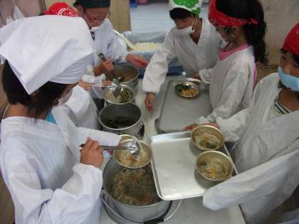 今日の給食は七夕献立。『七夕そうめん』は,天の川に見立てたそうめんと,星に見立てたオクラを入れて作っていただきました。他には,白ご飯,こぎつねちらしの具とだいこん葉のごま炒め,牛乳が組み合わされ,栄養のバランスもバッチリでした。