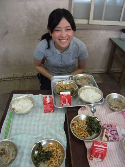 学生ボランティアのお姉さんと食べる給食は,笑顔いっぱいの3年生の教室でした。