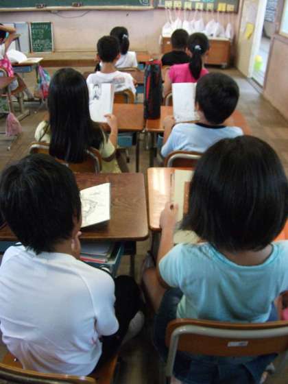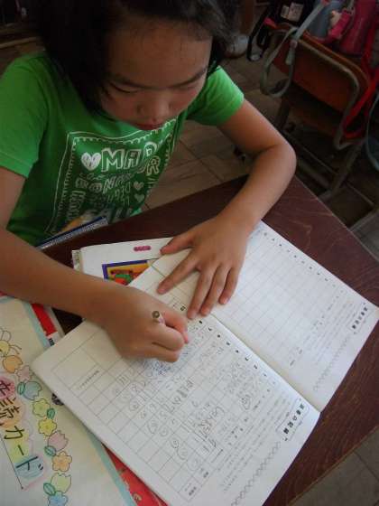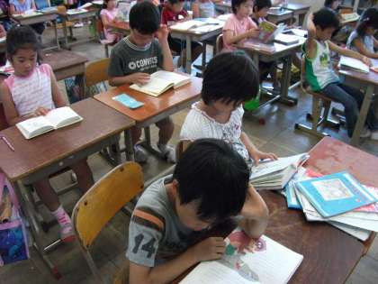 毎週月曜日の朝学習は全校読書です。読書ノートに記入している子どももいました。