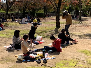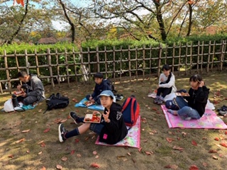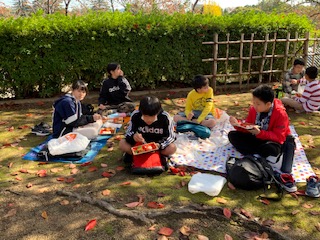 楽しい雰囲気で食べています。歩いたので少し暑い位です。秋のそよ風が気持ちいいです。みんな元気です。