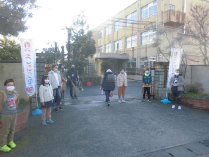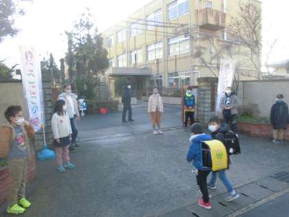 朝から児童会の子たちが校門であいさつ運動を行っています。