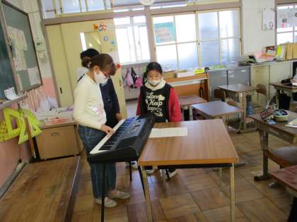音楽では「5つのせんりつで音楽をつくろう」という学習に取り組んでいます。ミ・ソ・ラ・ド・レの5つの音を組み合わせると,日本の雰囲気のせんりつができます。本当はリコーダーで演奏するのですが,今回はキーボードを使って自分のつくったせんりつを弾くことにしました。「なんかお祭りっぽい」「隣の音を使うと,簡単に弾けるね」と子どもたちは,自分が作ったせんりつを弾いて楽しんでいました。