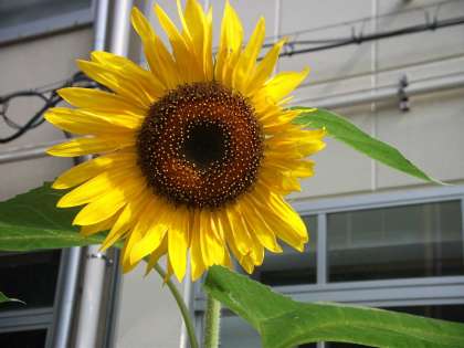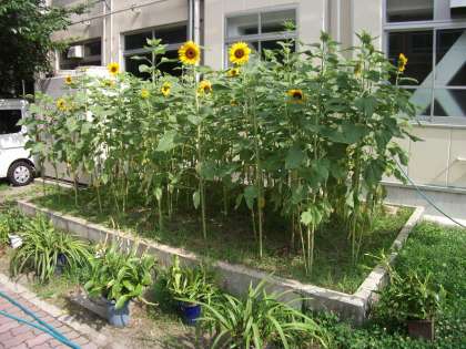 3年生と職場体験の中学生に世話してもらったヒマワリが咲き始めました。